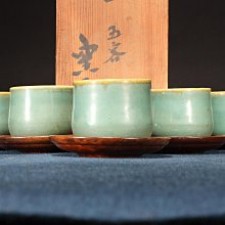 日本青瓷茶盞五客組常以優雅的天青色、細膩的開片及精緻的刻花為特色,