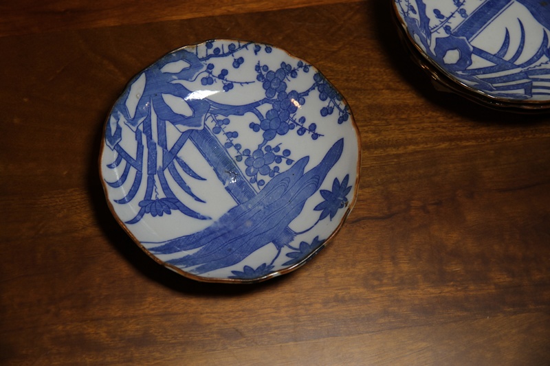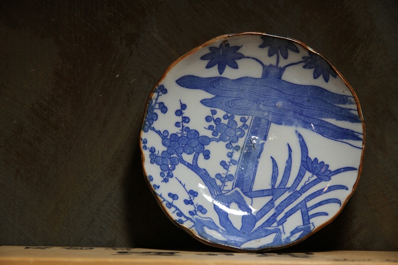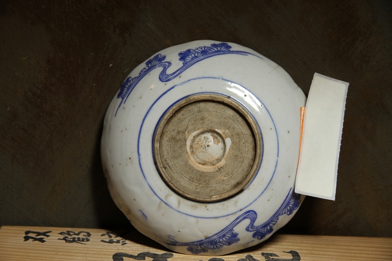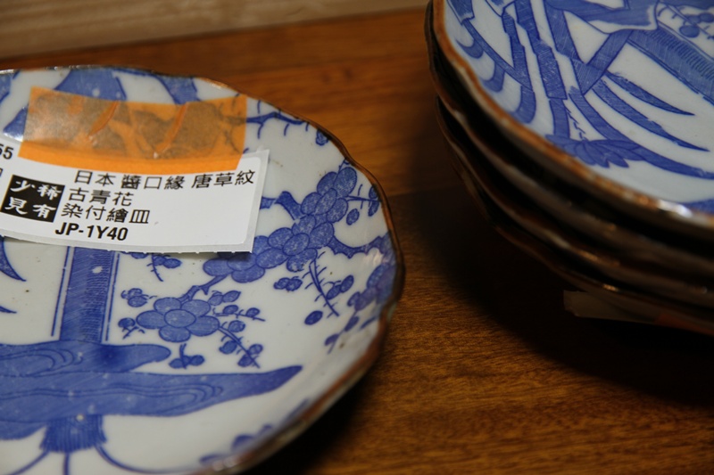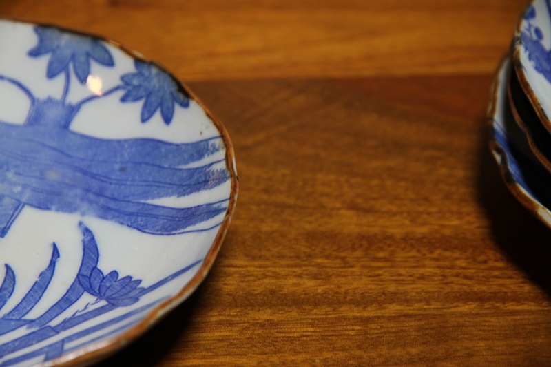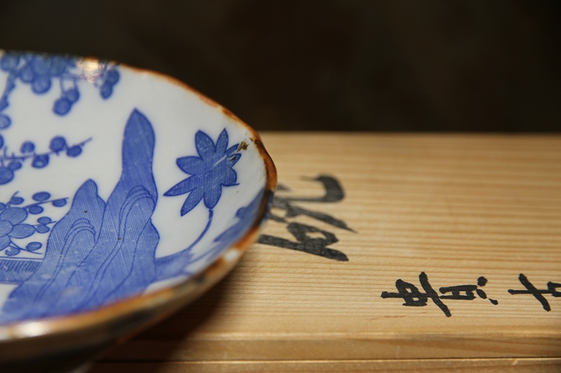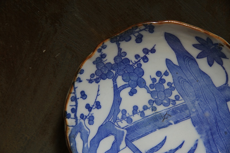這件物品為「古青花染付繪皿」,特徵為「醬口緣」(口沿塗褐色釉)與「唐草紋」(捲草紋)裝飾。這通常是指日本江戶時期至明治時期的青花瓷器,